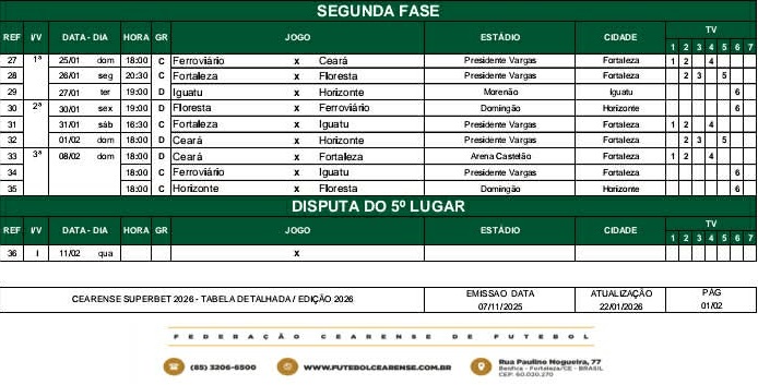 Após o encerramento da última rodada da fase de grupos do Campeonato Cearense, estão definidos todos os confrontos da segunda fase da competição. A FCF (Federação Cearense de Futebol) divulgou a tabela, ainda na noite da última quinta-feira (22).
