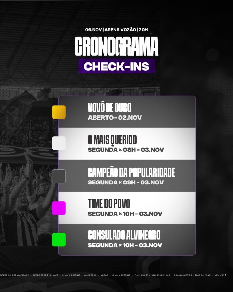 O cronograma segue uma fila de prioridades de acordo com o plano de cada torcedor. O “Vovô de Ouro” já foi liberado enquanto os demais abrem na segunda (3), mas em horários diferentes. “O Mais Querido” às 8h, “Campeão da Popularidade” às 9h, “Time do Povo” e “Consulado Alvinegro” às 10h.