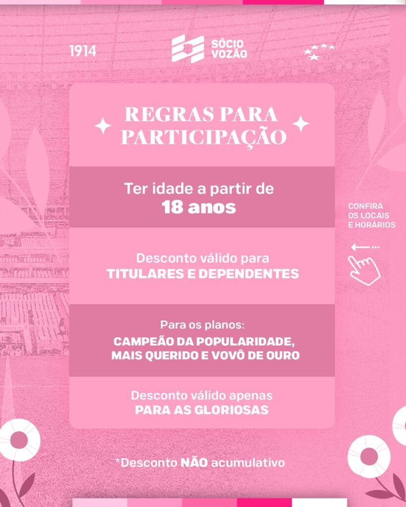 A campanha é válida apenas para torcedoras do sexo feminino, a partir dos 18 anos, sejam elas titulares ou dependentes destes três planos citados.