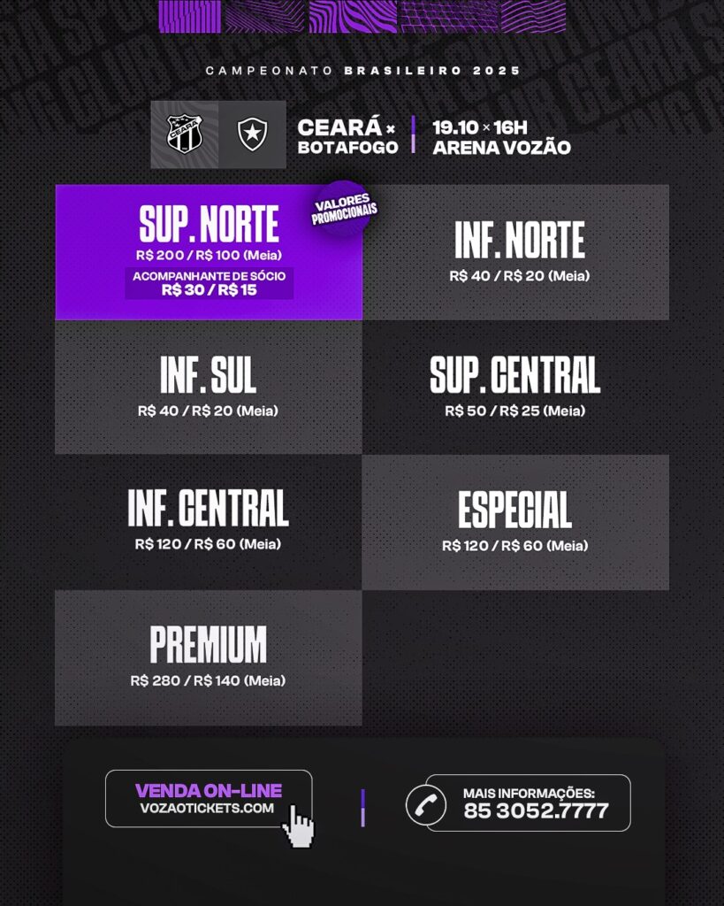 O Ceará deu início, nesta terça-feira (7), a venda de ingressos para a partida contra o Botafogo, no dia 19 de outubro, pela 29ª rodada da Série A do Brasileirão. Jogo está marcado para acontecer as 16h, na Arena Castelão.