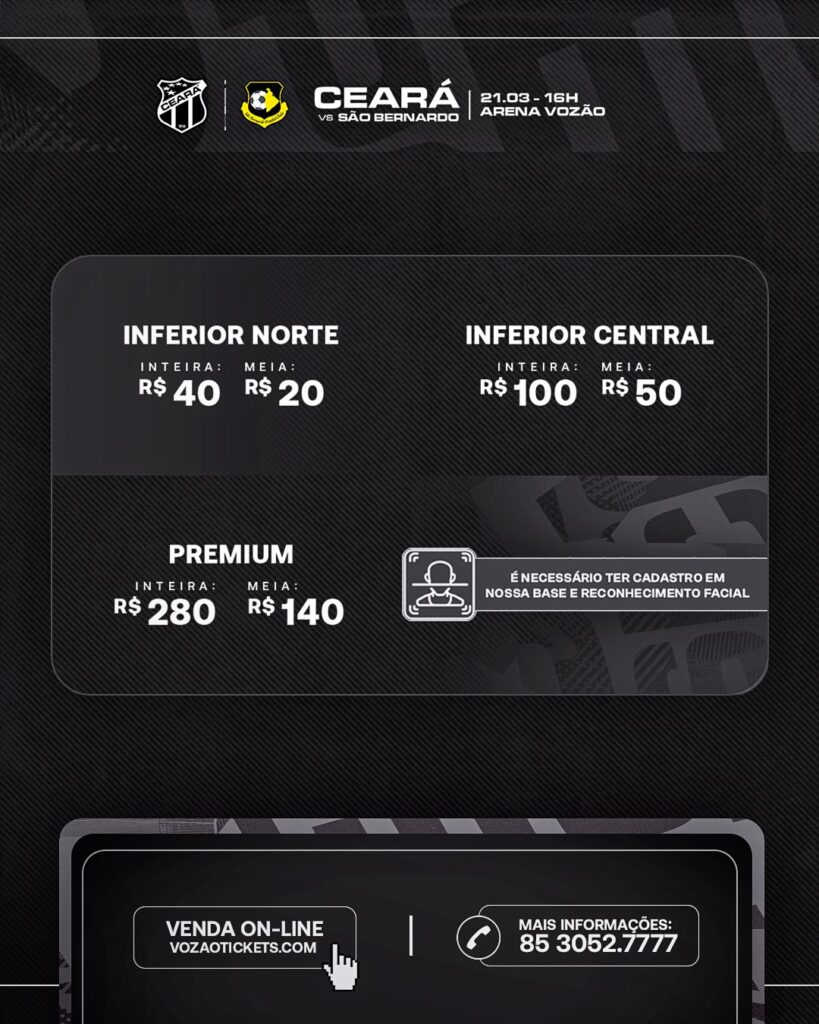 Os ingressos para a primeira rodada do Campeonato Brasileiro já estão à venda nas Lojas Vozão e no site Vozão Tickets. Para adquirir o ingresso e adentrar ao estádio, é obrigatória a realização do cadastro da biometria facial.