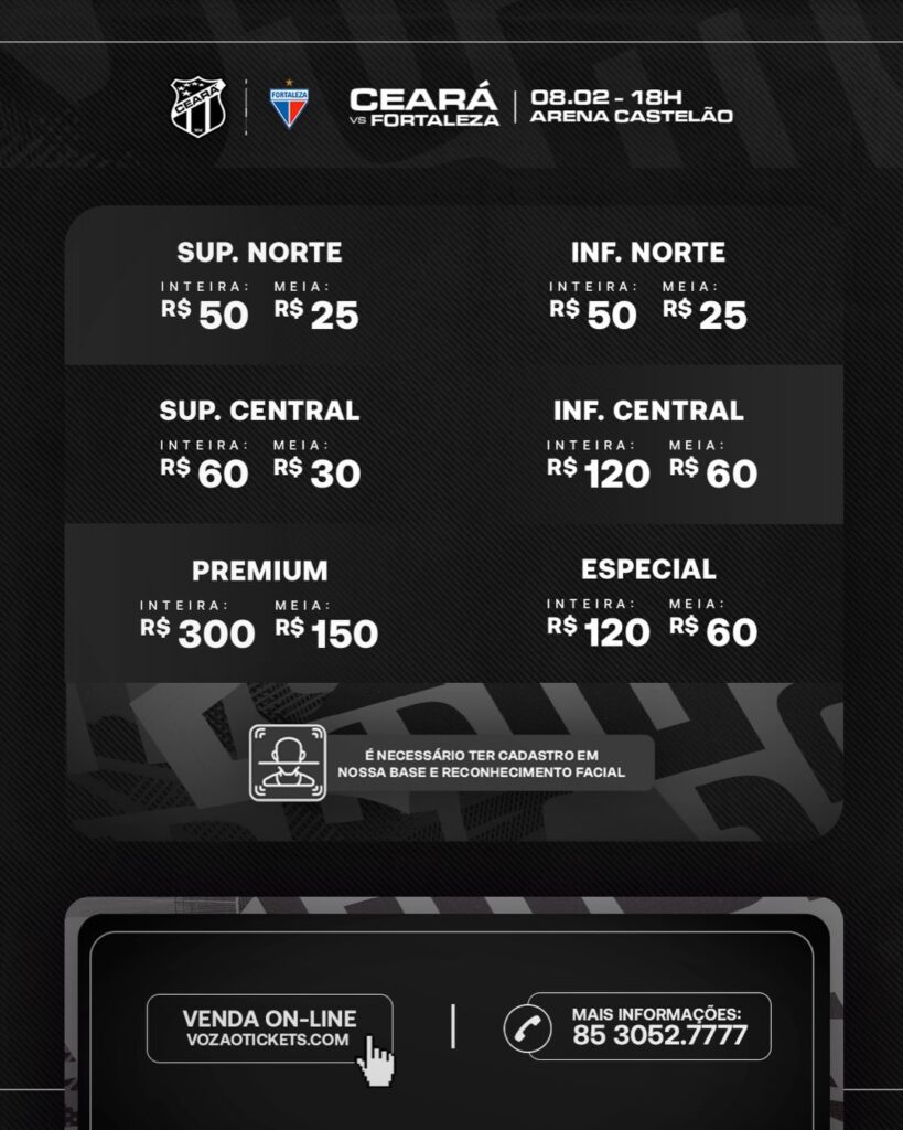 Mandante do Clássico-Rei, o Vovô terá à disposição as arquibancadas Superior e Inferior Norte, Superior e Inferior Central, Premium e Especial. As vendas estão acontecendo nas Lojas Vozão e também por meio do site Vozão Tickets. Vale ressaltar que é obrigatório o cadastro da biometria facial para adquirir o bilhete e adentrar ao estádio.