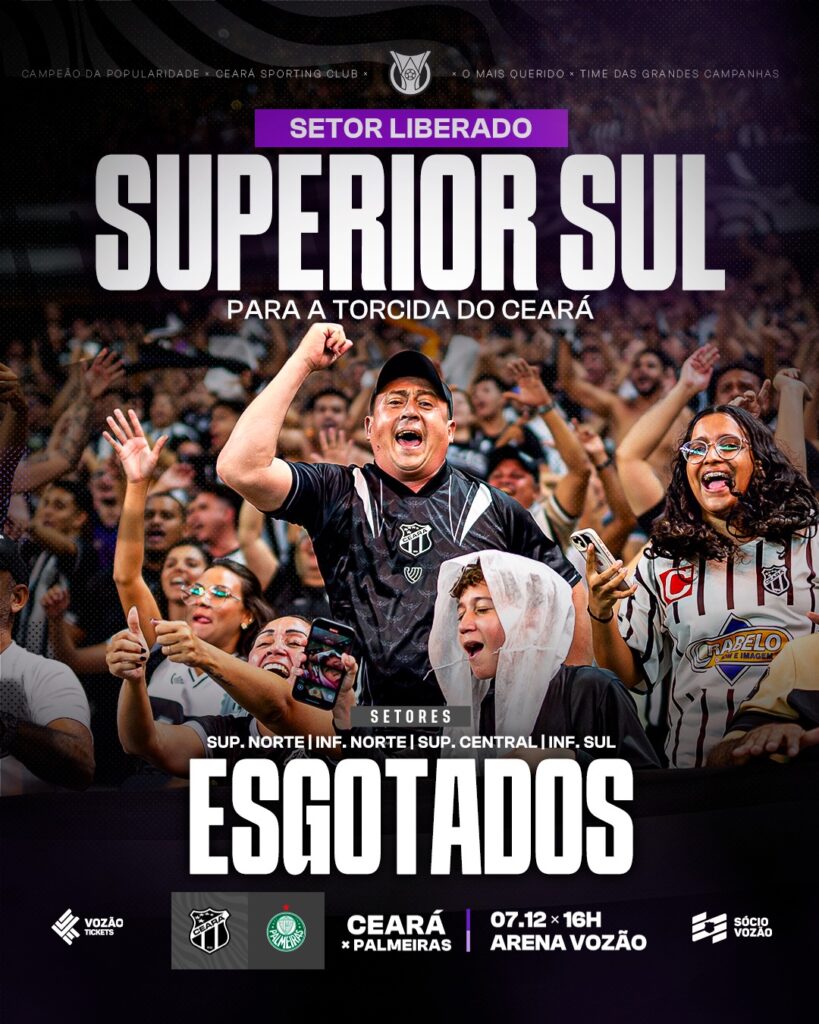 O Ceará divulgou que foi liberado mais um setor da Arena Castelão para a partida contra o Palmeiras-SP, no domingo (7). Com gexpectativa de grande público, o Vozão liberou o setor Superior Sul para jogo da 38ª rodada da Série A do Brasileirão.