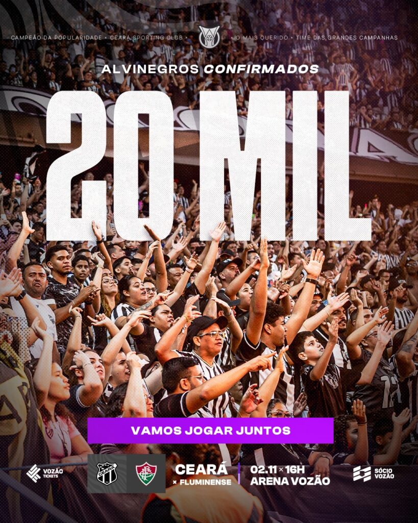 Mais de 20 mil torcedores estão confirmados para Ceará x Fluminense, marcado para as 16h do próximo domingo (2), na Arena Castelão, válido pela 31ª rodada da Série A do Campeonato Brasileiro.