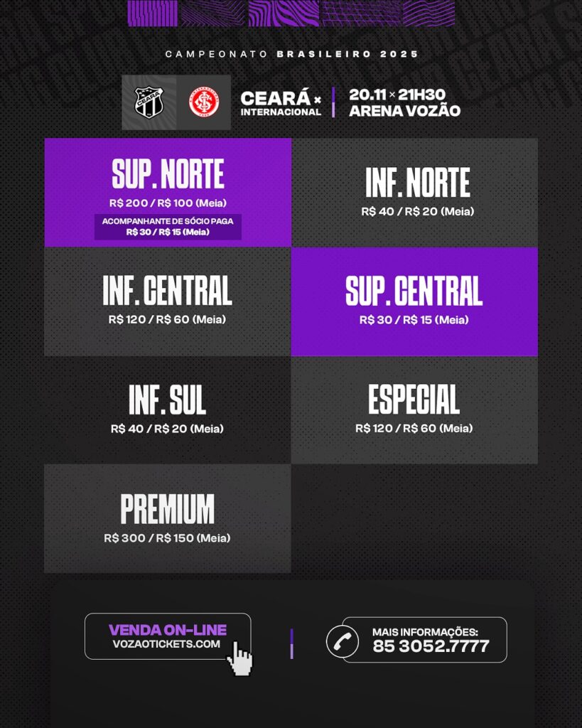 Mais de 30 mil torcedores já estão confirmados para este duelo. Os ingressos seguem à venda nas Lojas Vozão e também no site Vozão Tickets, onde o torcedor também já pode garantir seu ticket de estacionamento de forma antecipada.