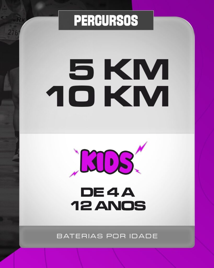 Os percursos serão de 5km e 10km e também haverá percursos para crianças de 4 a 12 anos, com baterias diferentes de acordo com a idade.