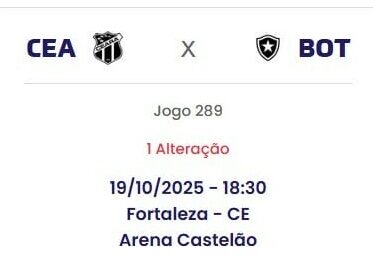 Desta forma, Ceará x Botafogo será 2h30 mais tarde do que o horário inicial, já que não vai mais acontecer as 16h e passou para as 18h30. Jogo será na Arena Castelão, no dia 19 de outubro.