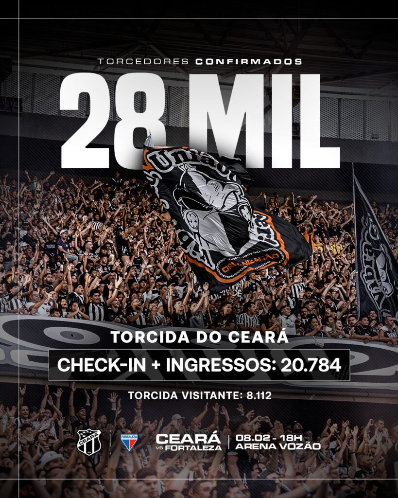 Mas, como já era esperado, o Clássico-Rei terá o maior públicado do Campeonato Cearense 2026. Mandante neste confronto, o Ceará divulgou, na noite desta quinta (5), que o total de 28.896 torcedores já garantiram presença. 20.784 são de alvinegros confirmados entre check-ins de sócios-torcedores e ingressos vendidos e os outros 8.112 são de tricolores via ingressos.