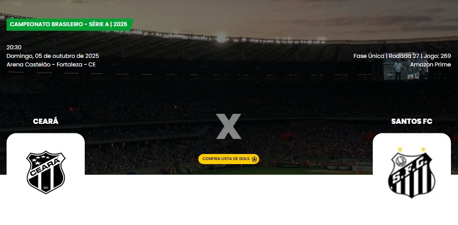 Ceará x Santos-SP vão se enfrentam na noite deste domingo (5). Às 20h30 a bola vai rolar na Arena Castelão, pela 27ª rodada da Série A do Campeonato Brasileiro. O duelo será transmitido com exclusividade pela Amazon Prime.