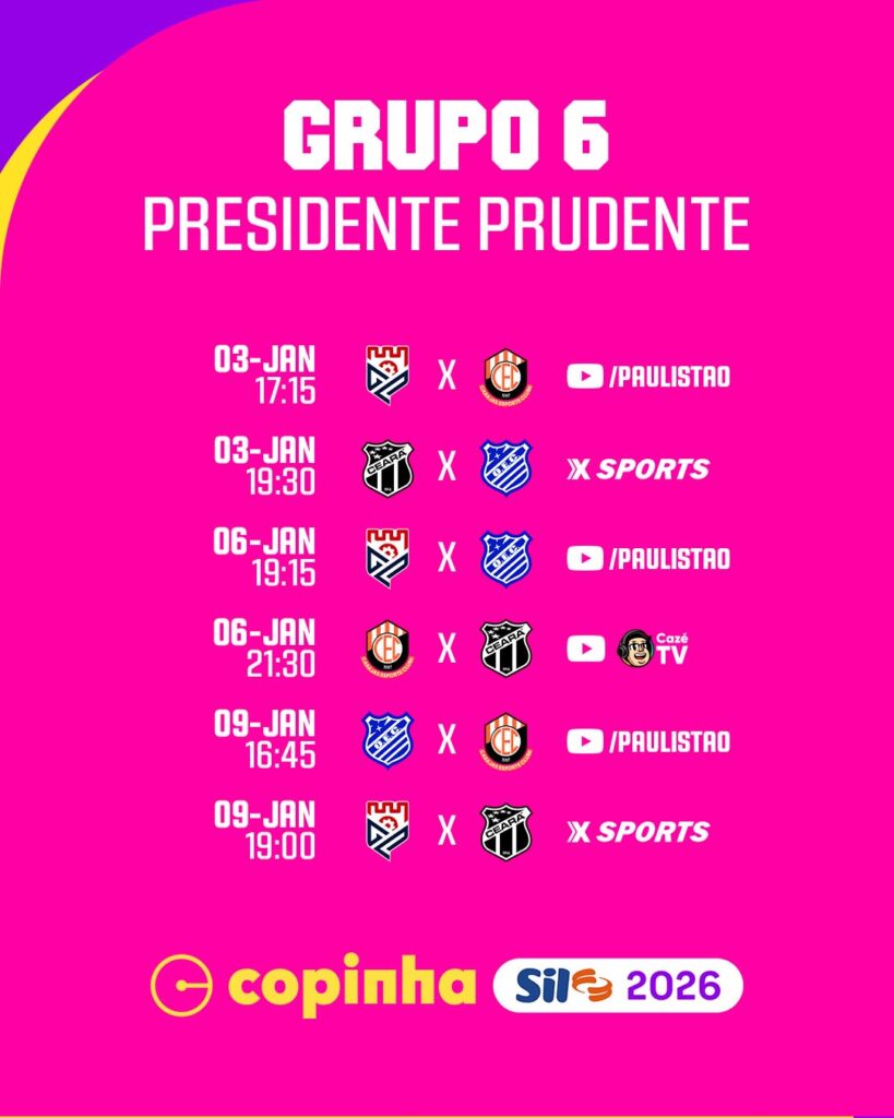O Ceará vai fazer parte do Grupo 6 e estreia contra o Olímpico-SE, no dia 3 de janeiro. O jogo será as 19h30. Todas as partidas do Vozão na primeira fase serão no estádio Prudentão, na cidade Presidente Prudente-SP. A transmissão será no X Sports.