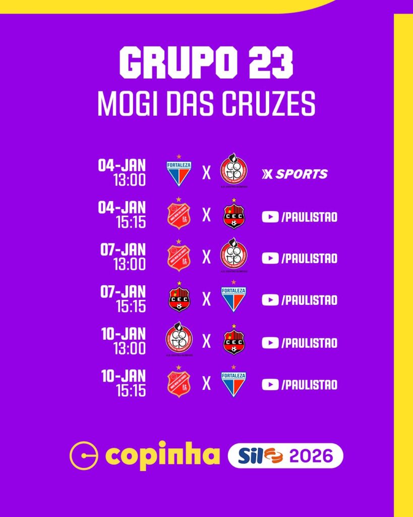 O Fortaleza fará sua primeira partida um dia depois, em 4 de janeiro. O adversário será o Central Olímpico-SP, às 13h, com transmissão no X Sports. A cidade sede do Leão será em Mogi das Cruzes. O Leão é o atual campeão do Cearense Sub-20.