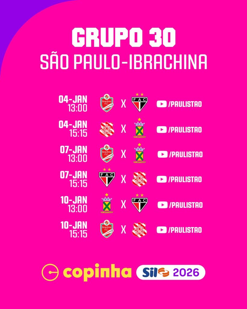 No mesmo dia, também às 13h, o Ferroviário fará sua primeira partida na Copinha. Seu adversário será o Ibrachina-SP. A transmissão vai acontecer no YouTube do Paulistão. A equipe coral vai ter como sede o CT do Ibrachina, em São Paulo.