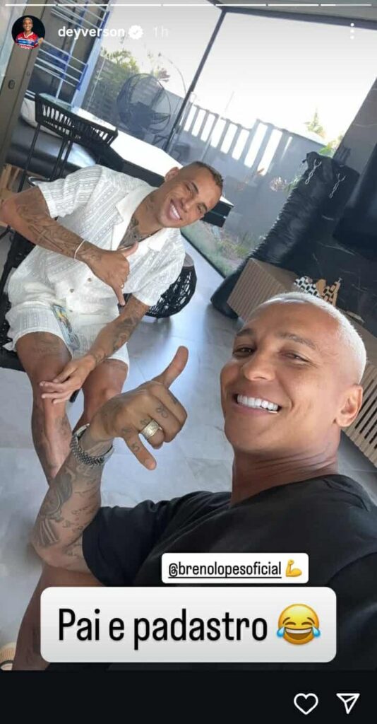 Deyverson “tirou onda” com o Flamengo na web após vitória do Fortaleza de 1 a 0, pela 30ª rodada da Série A do Brasileirão. Em foto com Breno Lopes, autor do gol do triunfo leonino, ele colocou a legenda “pai e padrastro“.
