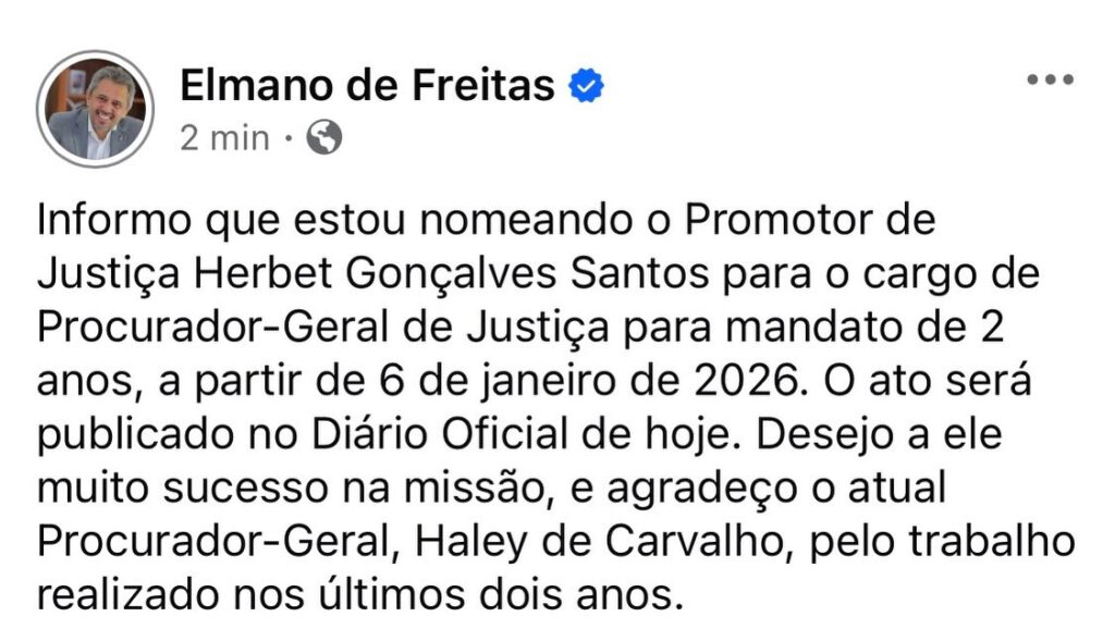 “Informo que estou nomeando o Promotor de Justiça Herbet Gonçalves Santos para o cargo de Procurador-Geral de Justiça para mandato de 2 anos, a partir de 6 de janeiro de 2026. O ato será publicado no Diário Oficial de hoje. Desejo a ele muito sucesso na missão, e agradeço o atual Procurador-Geral, Haley de Carvalho, pelo trabalho realizado nos últimos dois anos”, escreveu Elmano de Freitas, Governador do Estado.