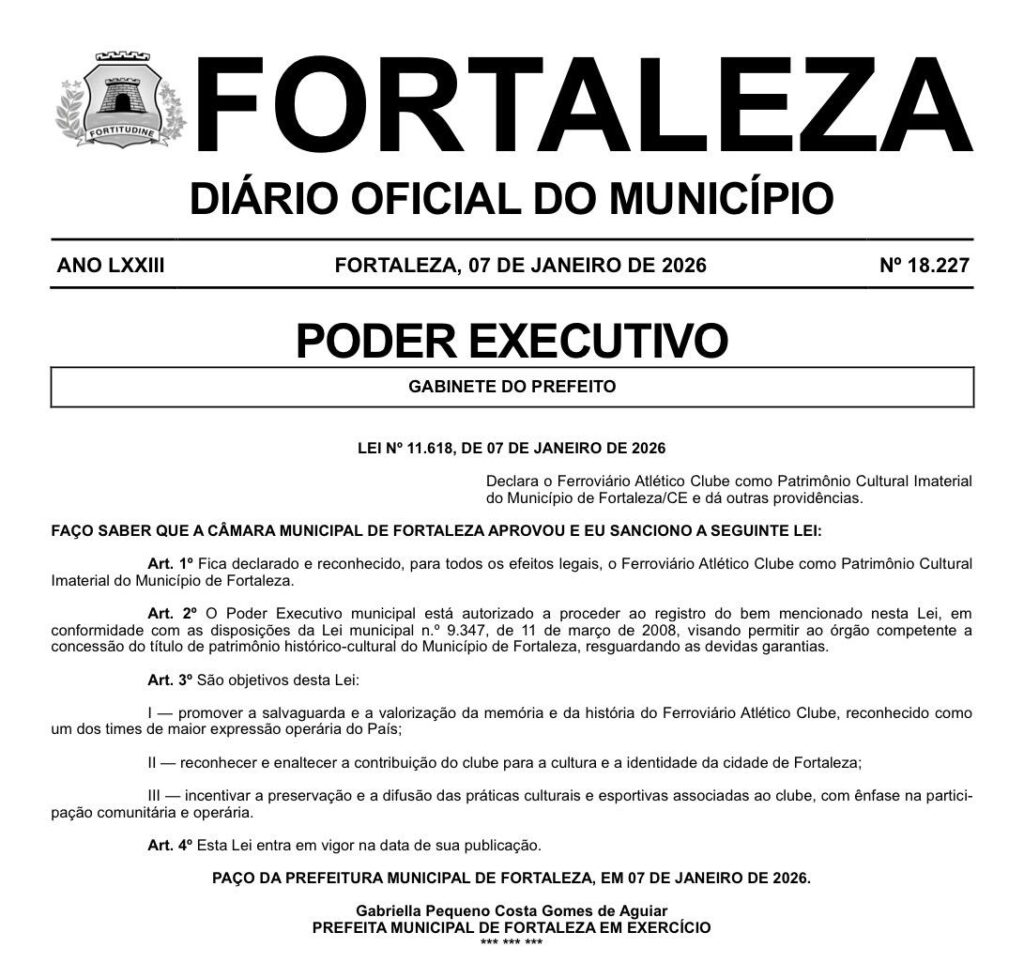 O Ferroviário AC foi declarado como Patrimônio Cultural Imaterial de Fortaleza. A Lei Municipal Nº 11.618 foi sancionada pela Prefeitura de Fortaleza e publicada na última quarta-feira, dia 7 de janeiro. Nas redes sociais, o clube comemorou e tratou como um “marco histórico”.