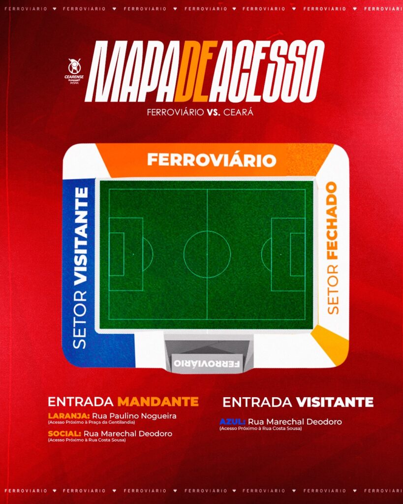 A torcida do Ferroviário ficará nas asrquibancas Laranja e Social e a torcida do Ceará terá à disposição as arquibancada Azul, onde costumeiramente fica em clássicos no PV, e na Amarelo extra.