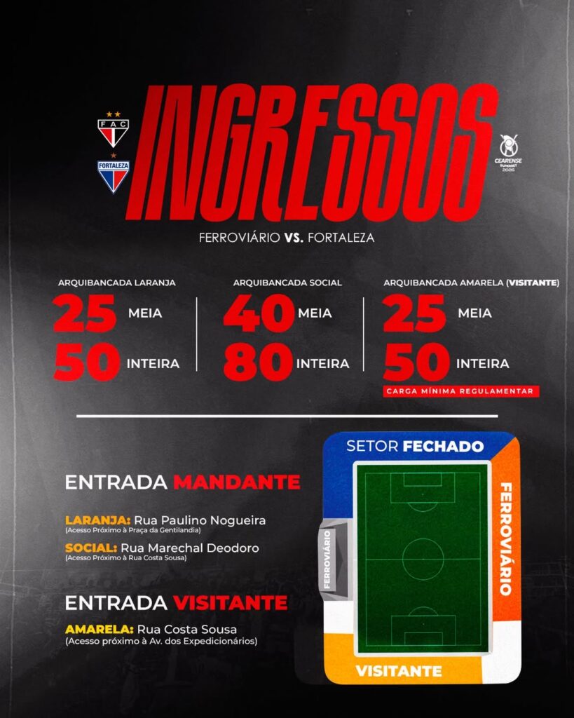 Para o torcedor que for acompanhar diretamente das arquibancadas do estádio Presidente Vargas (PV), os ingressos estão custando R$80 inteira e R$40 meia-entrada na Arquibancada Social e R$50 inteira e R$25 meia-entrada na Arquibancada Laranja para a torcida do Ferroviário.