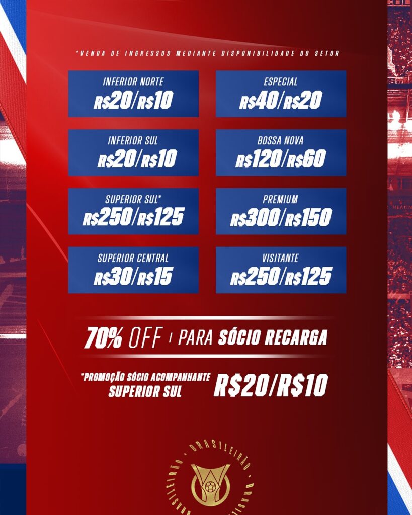 Para este jogo, os ingressos já estão à venda com valores a partir de R$10 para a torcida do Fortaleza. Já para a torcida do Flamengo, os valores são de R$125 meia-entrada e R$250 inteira.