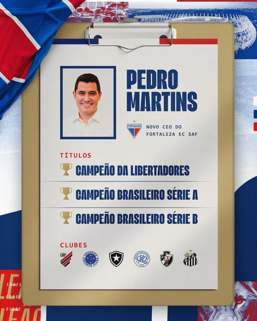 O Fortaleza “correu contra o tempo” e já anunciou seu novo CEO, no início da noite deste domingo (28). De forma oficial, o clube comunicou que Pedro Martins é o quem chega para assumir o comando do cargo.