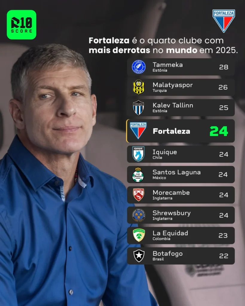 O Fortaleza faz uma temporada de destaque muito negativo. O Leão é o time com mais derrotas na Série A do Brasileirão, ao lado do Juventude-RS, e o quarto time do mundo que mais perdeu em 2025.