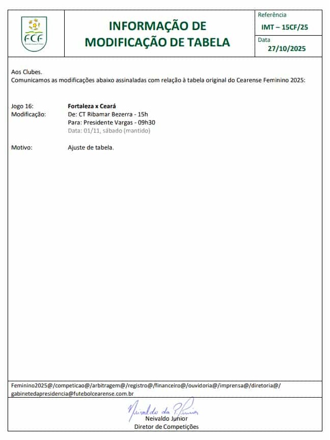 Fortaleza x Ceará sofreu alterações de horário e local. Válido pela 6ª rodada da primeira fase do Campeonato Cearense Feminino, o Clássico-Rainha acontecerá no próximo sábado (1), às 9h30, no estádio Presidente Vargas (PV).