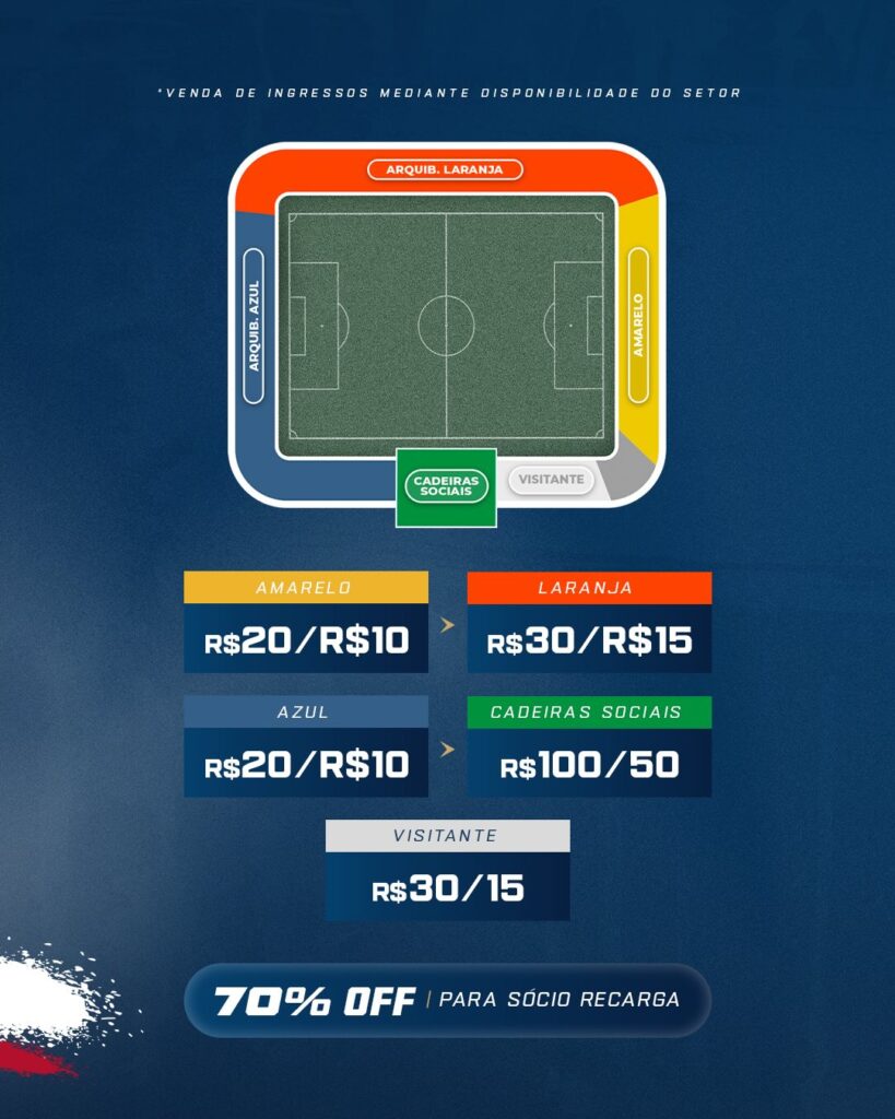 Para a torcida do Quixadá, os ingressos serão de R$30 inteira e R$15 meia. Haverá venda de ingresso físico no localVale ressaltar que é obrigatória a realização da biometria facial para poder adentrar ao estádio.