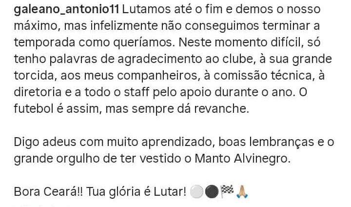 “Lutamos até o fim e demos o nosso máximo, mas infelizmente não conseguimos terminar a temporada como queríamos. Neste momento difícil, só tenho palavras de agradecimento ao clube, à sua grande torcida, aos meus companheiros, à comissão técnica, à diretoria e a todo o staff pelo apoio durante o ano. O futebol é assim, mas sempre dá revanche. Digo adeus com muito aprendizado, boas lembranças e o grande orgulho de ter vestido o Manto Alvinegro. Bora Ceará!! Tua glória é Lutar”, escreveu Galeano.