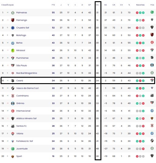 Bahia (30), Mirassol-SP (28), Fluminense (31), São Paulo (28) e RB Bragantino-SP (38), estão acima do Alvinegro na tabela, que ocupa o 10º com 34 pontos. Mas, todos esses times viram suas redes balançadas em mais oportunidades que o time de Porangabuçu.