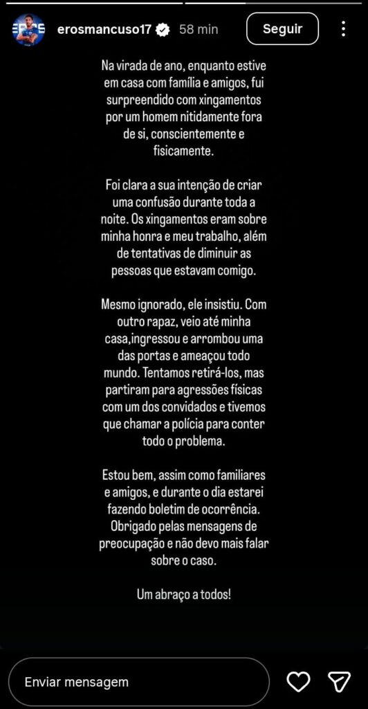 Eros Mancuso terminou o texto afirmando que vai realizar um Boletim de Ocorrência ainda nesta quinta, dia 1º de janeiro, e que não vai voltar a se pronunciar a respeito deste ano.