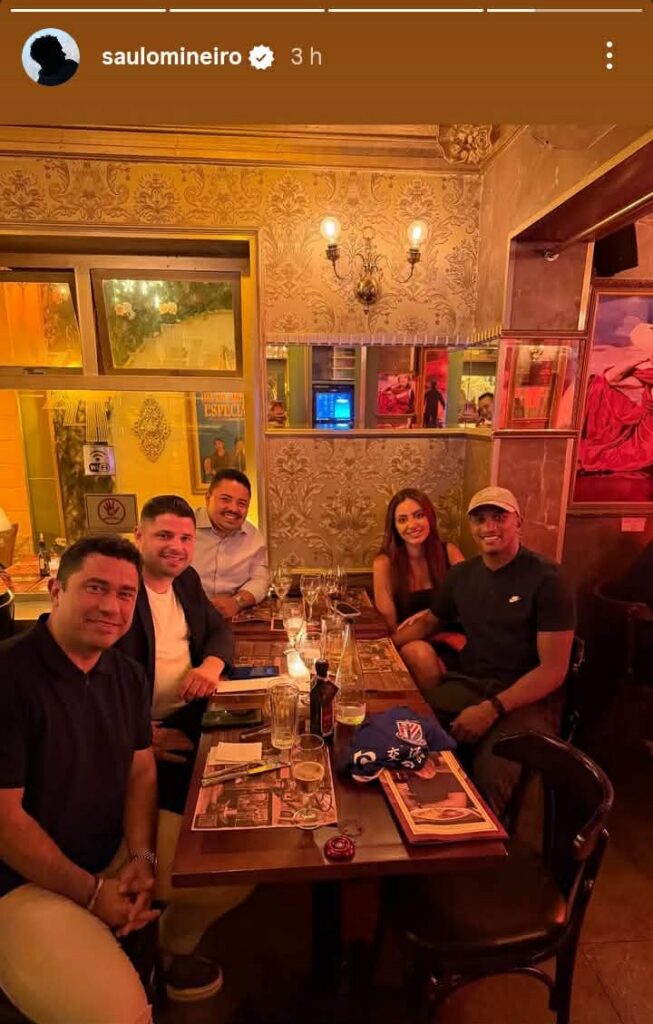 Jogador com duas passagens de sucesso por Porangabuçu – a primeira entre 2020 e 2021 e a segunda sendo peça fundamental na campanha de acesso à Série A do Brasileirão em 2024 -, Saulo participou de um jantar com o mandatário alvinegro. Nara, esposa de Saulo Mineiro e mãe da filha do casal, também esteve presente.