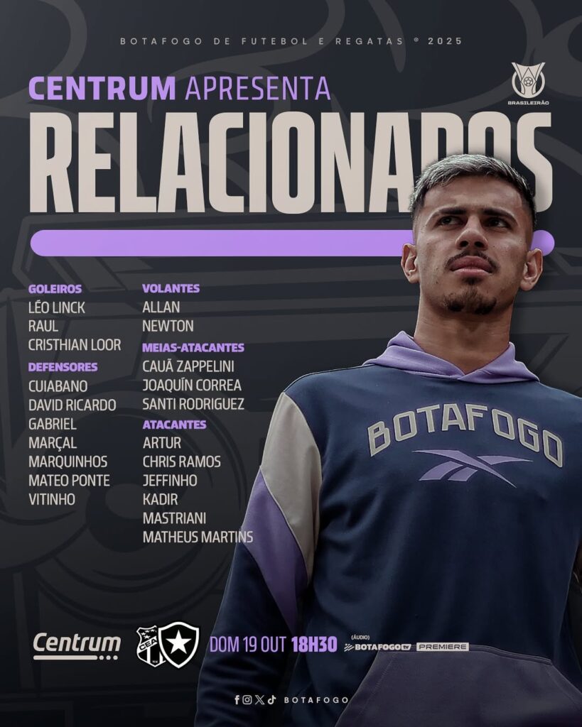 O Botafogo divulgou, neste sábado (18), a lista de relacionados para a partida do próximo domingo (19), contra o Ceará, pela 29ª rodada da Série A do Brasileirão. Arthur Cabral, revelado pelo Vozão e agora no time carioca, é desfalque confirmado.