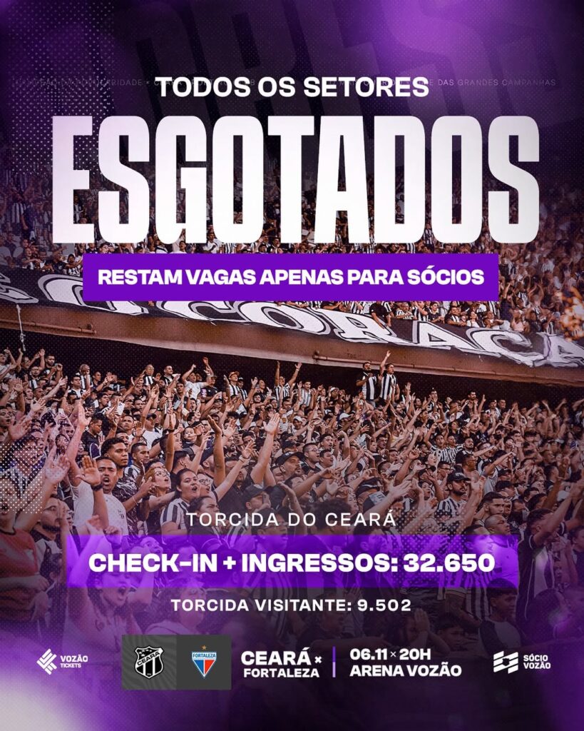 A torcida do Ceará já esgotou os ingressos de todos os setores para o confronto com o Fortaleza, marcado para a próxima quinta-feira (6), na Arena Castelão, pela 32ª rodada da Série A do Campeonato Brasileiro. Restam apenas vagas para sócios-torcedores.